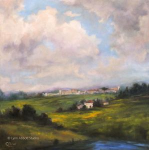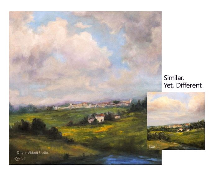 I enjoyed finding the differences in the paintings, Lynn. At first I thought it was primarily the shape of the clouds, but then I noticed how the light from the sun gave the separate paintings a different tone. The sun in the smaller painting was casting a more golden hue on the clouds and landscape. What a fitting example of this story of your dad and son. Also of Elijah and Elisha. Alike but different. I smiled as I imagined your son at 12 months already lecturing his stuffed animals. 🙂 And yes, may we pick up Christ’s mantle! Thank you for always encouraging my heart with your lovely paintings and stories! Love and hugs to you!